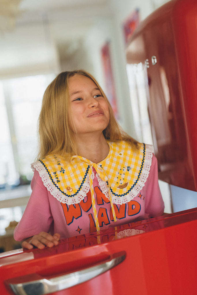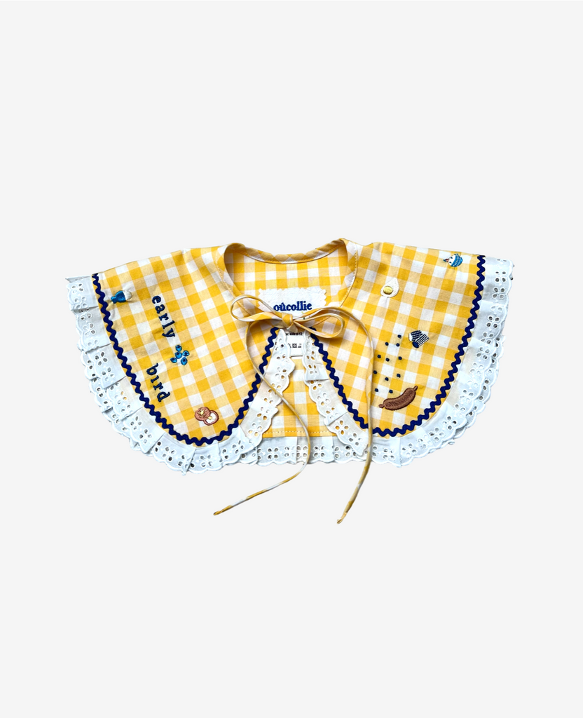 This charming yellow and white checkered collar is embroidered with little pieces like tiny sosuage in a front of collar and finished with ultramarine zig-zag ribbon.