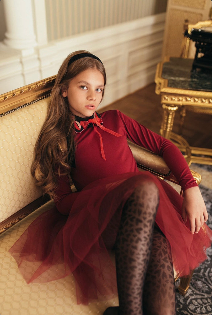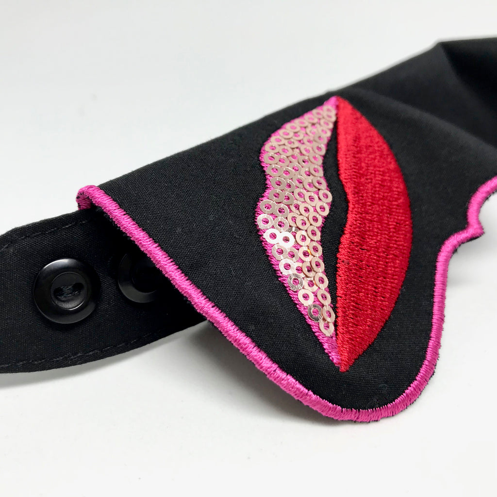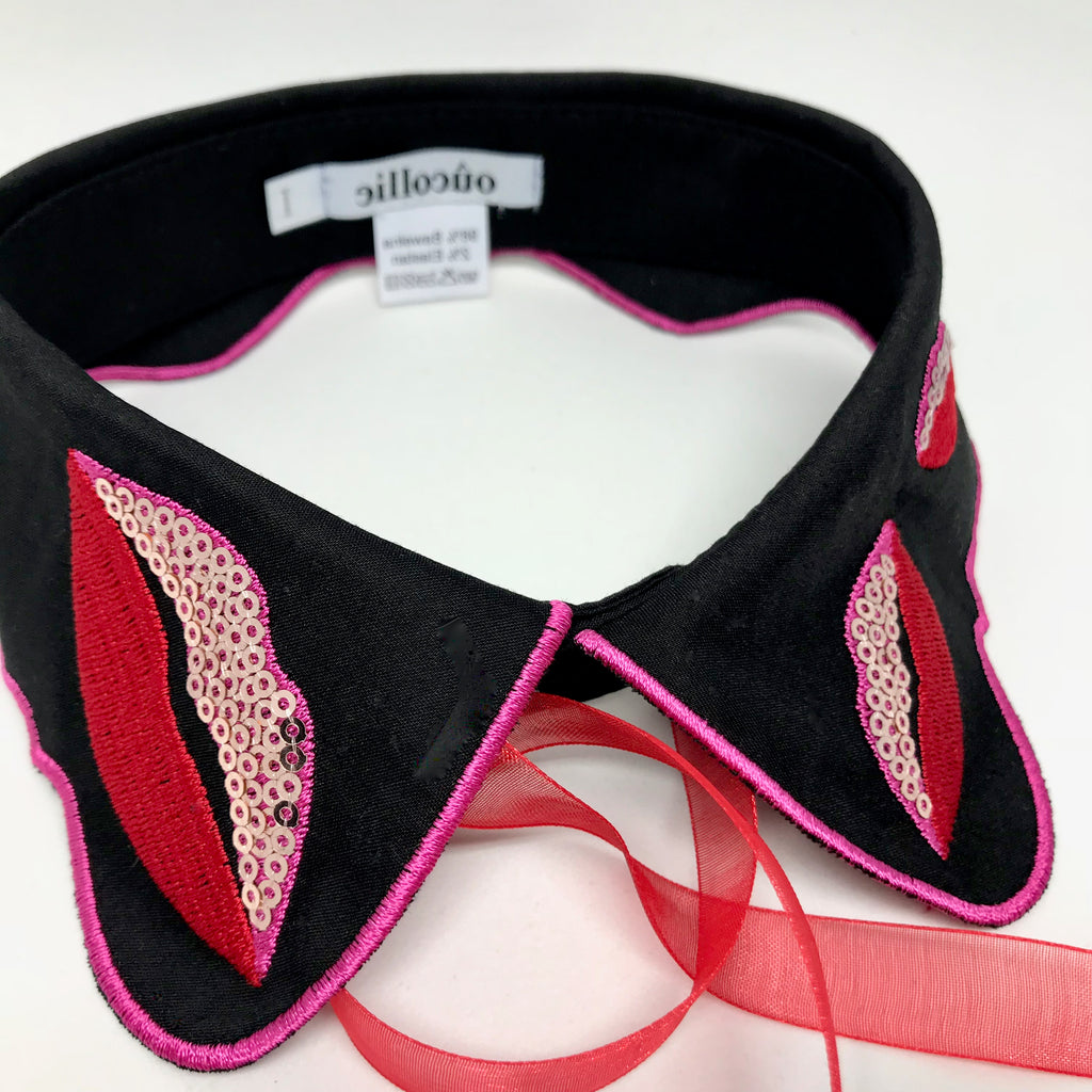 This original Bisette collar is made of delicate black premium cotton. Red and pink appliqué is finished with small sequins, along with a delicate organza ribbon will give the styling a unique finish. For every occasion.