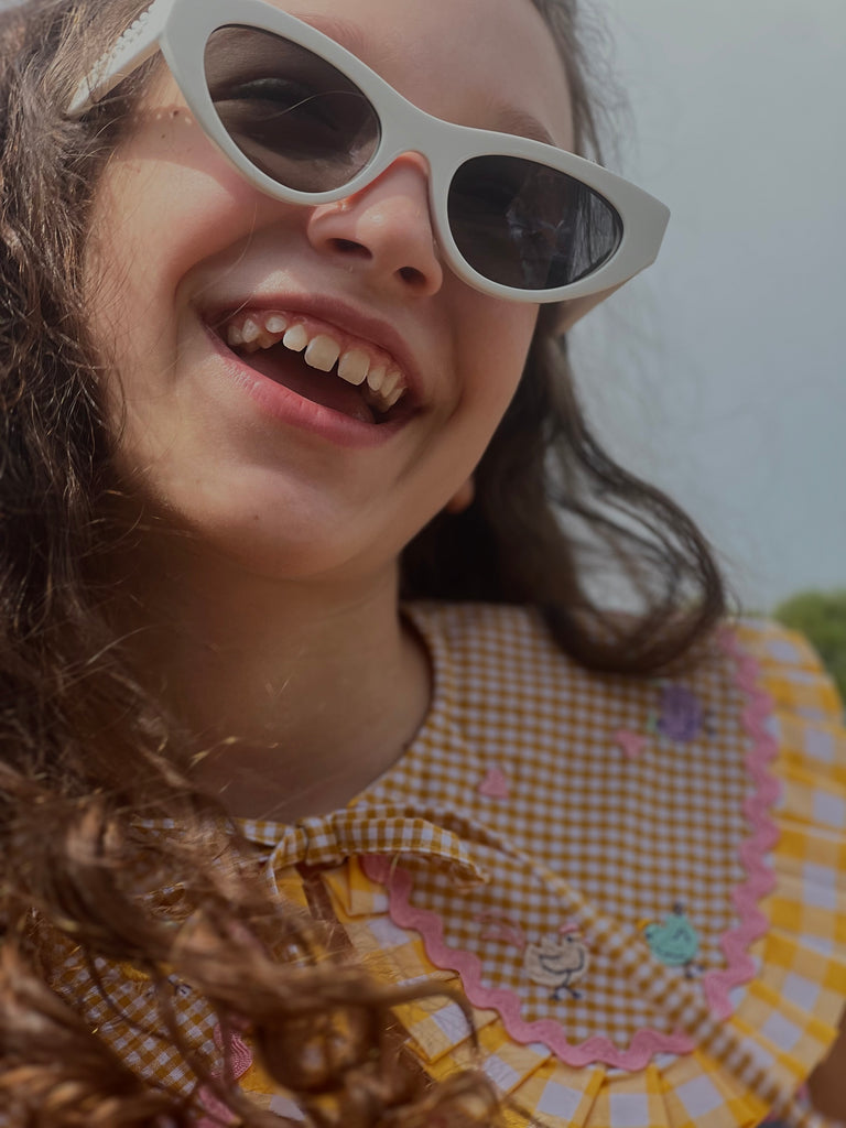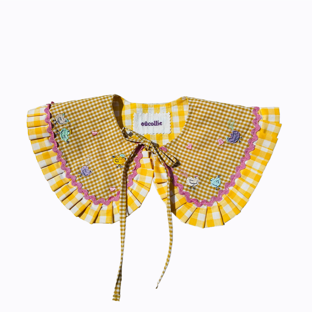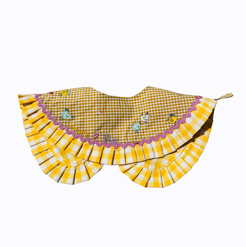 This charming yellow and white checkered collar with embroidered chickens made by Pola is a perfect addition to a girl's wardrobe and will create a stunning effect combined with summer dresses or t-shirts.